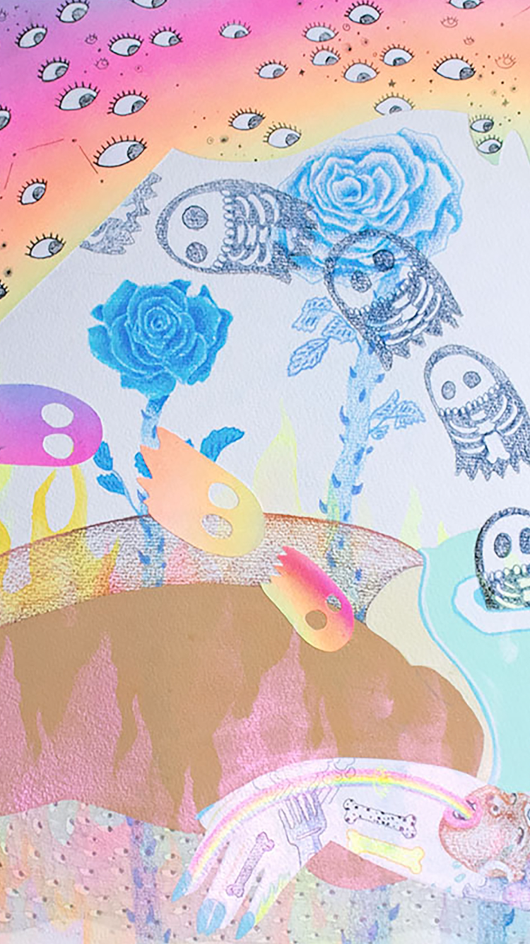 Small drawing on paper. A thick femme figure lays down in slumber on a ground of flame and shadow. Electric blue dream roses grow through her disappearing body and out of her thighs. Her face and limbs are painted in fluorescent browns, one arm a stark white full of symbols for everyday cosmologies. The number zero on her stomach opens into a hole from which midnight colored ghosts with x-ray skeletons fly out. Arching over her body is a rainbow silhouette rooting into her feet and head, and covered in gazing black and white eyes.