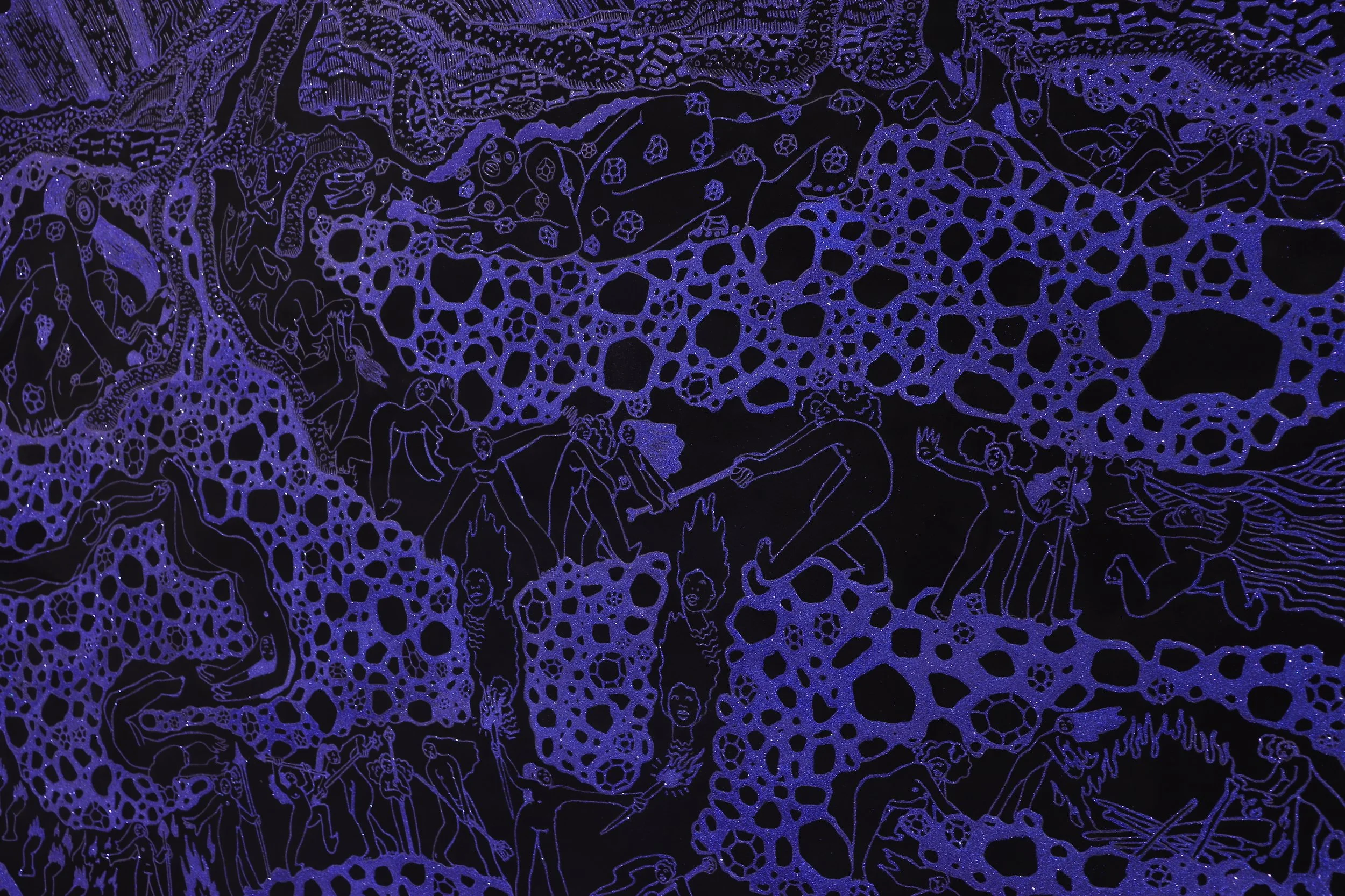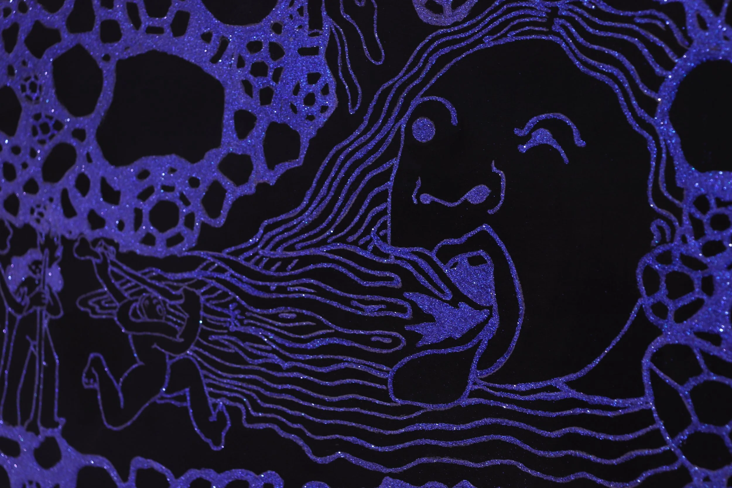 Images are of a large drawing on velvet black paper outlined with aura-purple glitter. Dark diamond paper mining girls erupt from a stormy volcano and tumble deep into the depths and heavenly crevices of the black underground, tossing, turning, pleasuring, fighting, digging, finding their way and summoning their spirits.
