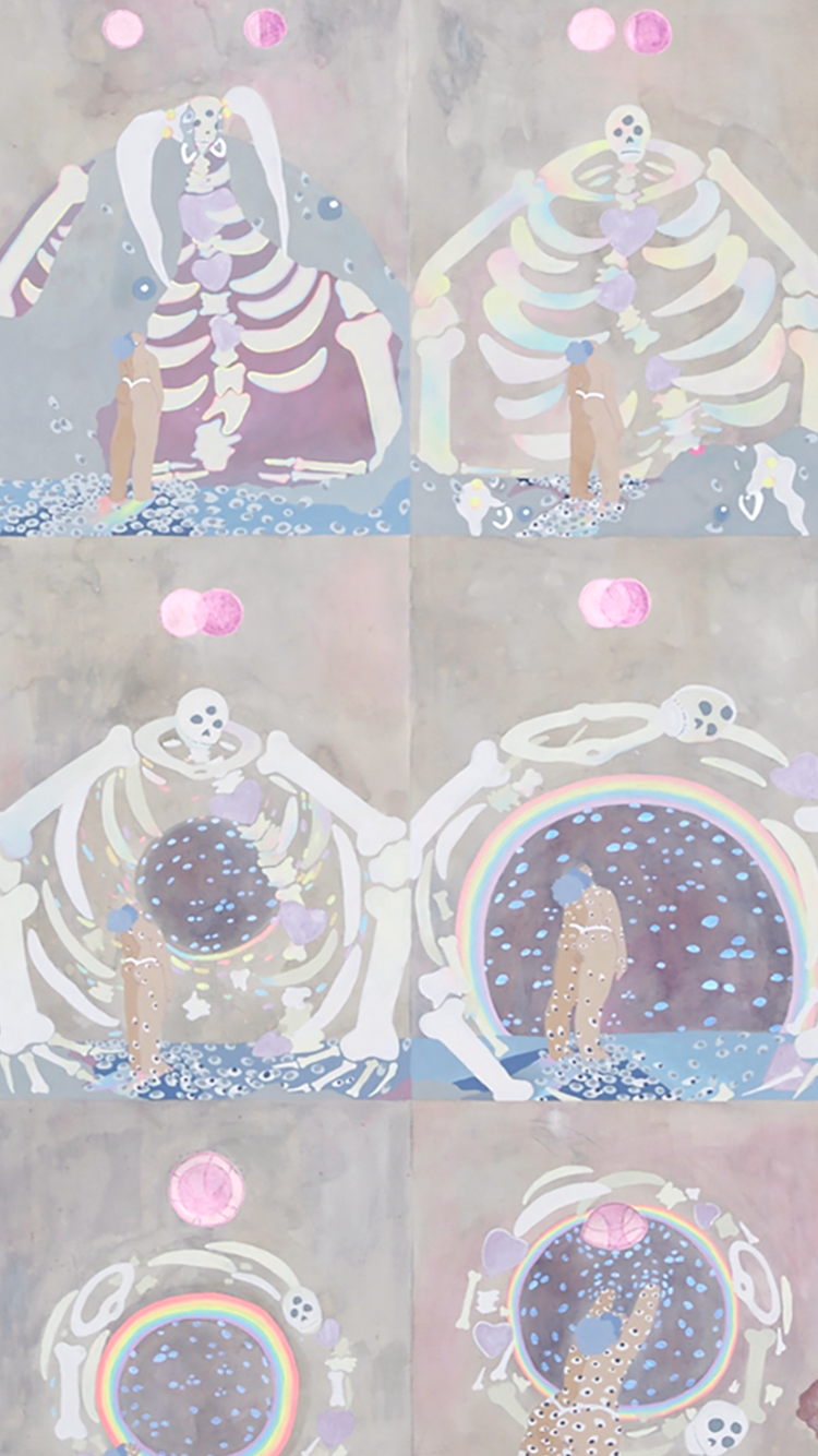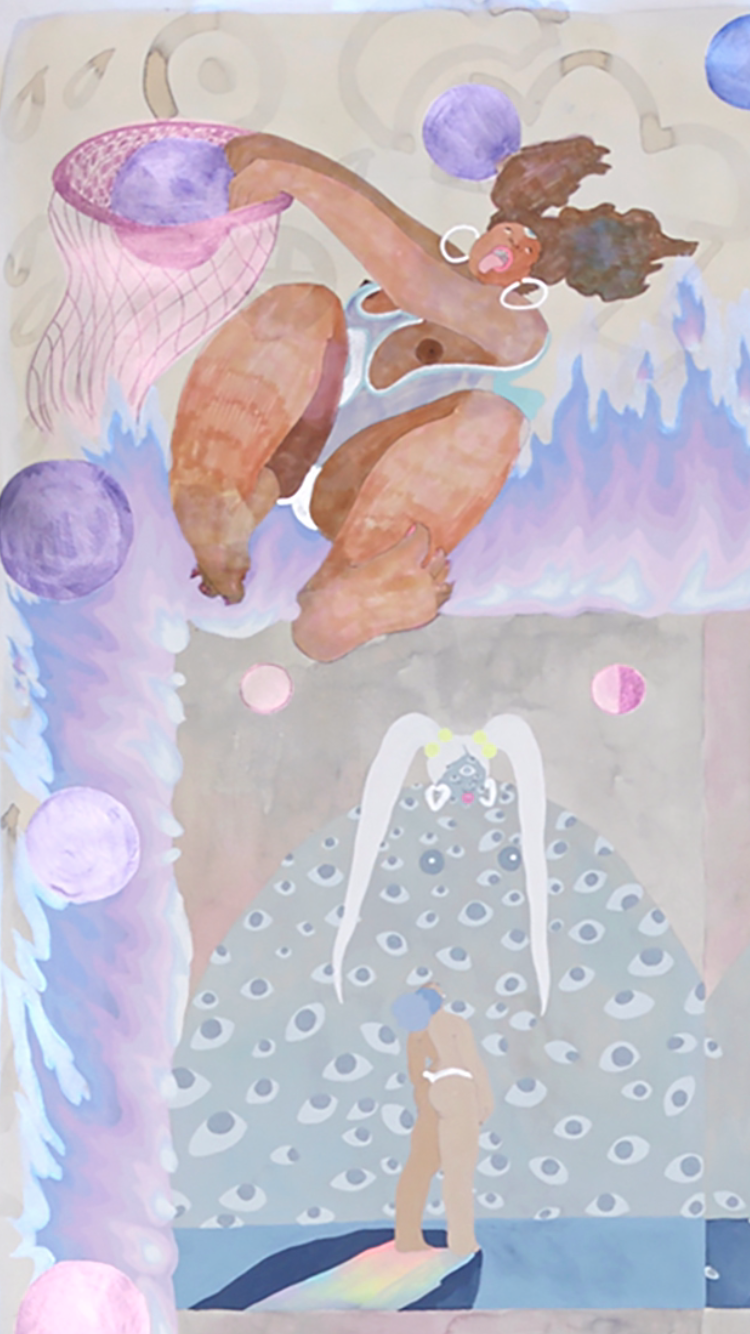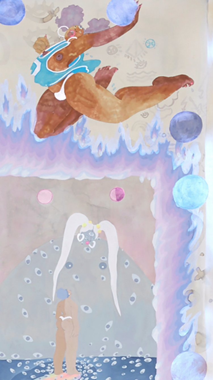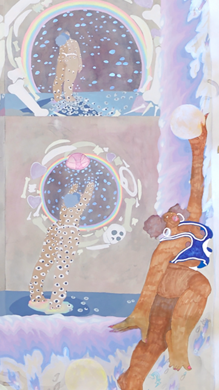 11 ft paper scroll containing eight sequential drawings. In the sequence, a little naked figure in silver thongs stands looking up at a mountainous figure, towering above her. Her body casts a rainbow shadow. The giant has a round body like a mountain, her long white pigtails droop down to touch the ground. Her body is gray and covered in eyes. Two moons of different phases in time hover in opposite corners. As the sequence progresses, the mountain/giant/femme sheds her face, skin, and hair, baring her big boned glowing skeleton. Her bones and guts fall apart and rearrange themselves into a dark portal, rimmed in a rainbow circle. The little one jumps in, head first. The phases of the moon combine to make a basketball, dunking in the portal. Surrounding this story are purple flames bursting along the edges, and team players slam-dunking a gradient moon.